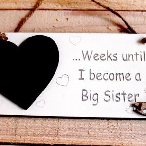 Your Baby Announcement Gift for Big Sister sign measures approx 15.6cm x 7.6cm, is 6mm thick and is hung with natural jute twine. The heart is painted using high quality blackboard paint so you can update the numbers of weeks left until the happy day!