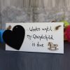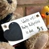 Cut by hand, this wooden plaque is then prepared and painted in house (this applies to all of our plaque gifts). The plaque can read for example ‘Until Baby Jude is due’ with a chalkboard heart so you can countdown the days. The plaque is decorated with a little wooden blue baby grow and blue ribbon. Approx 15.6cm x 7.6cm x 0.6cm, includes hanging twine and chalk.