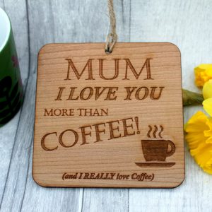 Mum I Love You More Than Love Coffee Gift Sign. Add your name to the bottom if you want. Professionally Laser Cut and Personalised. Made to order in Scotland. Made from Cherry Veneer wood.