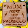 Mum I Love You More Than Love Gin Coaster. Add your name to the bottom if you want. Professionally Laser Cut and Personalised. Made to order in Scotland. Made from Cherry Veneer wood.