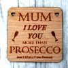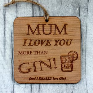 Mum I Love You More Than I Love Gin Gift Sign. Add your name to the bottom if you want. Professionally Laser Cut and Personalised. Made to order in Scotland. Made from Cherry Veneer wood.