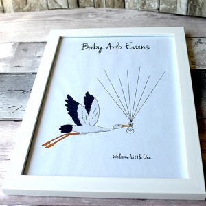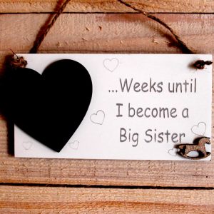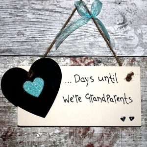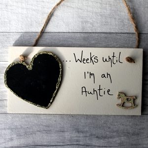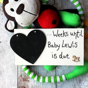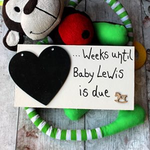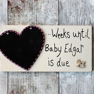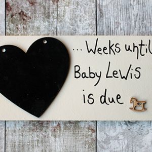Cut by hand, this wooden plaque is then prepared and painted in house (this applies to all of our plaque gifts). The plaque can read for example ‘ weeks Until Baby Lewis is due’ with a chalkboard heart so you can countdown the weeks or days. The plaque is decorated with a little yellow baby grow and yellow ribbon. Approx 15.6cm x 7.6cm x 0.6cm. Includes hanging twine and chalk.