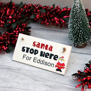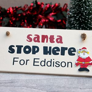 The plaque is painted cream with the words on the plaque read ‘Dear Santa Please stop here…’