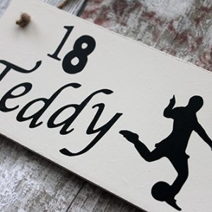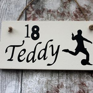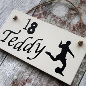 This “18 Teddy” personalised 18th birthday gift ideas plaque makes the perfect gift for a Footabller on his or her Birthday or any special occasion as a gift. These plaques are great 18th birthday gift ideas for any deserving Footballer. It measures 6inches by 3inches approx is handwritten, handmade and professionally made in the UK! It can hang from any wall, door or any other possible place you could hang a plaque from, with the natural twine which is included. Show your Footabller that he or she is the best by getting him this 18th plaque! If your Footballer isn’t 18, then no problem let us know by inputting his or her age in the text box.