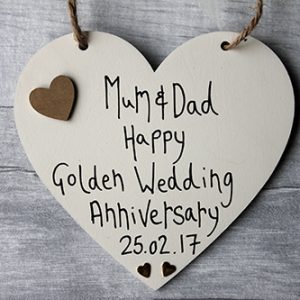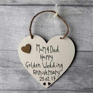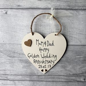 This Personalised Golden wedding anniversary gift Heart is the perfect gift to give your Parents! It is a unique and thoughtful way to congratulate someone in a way that will last a lifetime. Hang it on your wall to make a memorable beautiful home decoration. If you would like any other wording just me know – I am happy to change the writing to suit. Ideal gift for your Anniversary to tell them you love them.
