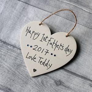 Looking for a gift for daddy? Handcrafted in our workshop and finished with beautiful blue jewels, this Happy 1st Fathers Day Daddy Sign is so cute for a great new dad gift. Add the names of your children on the screen and we will make this to order for you. Any Dad or Daddy will just love this Fathers Day present and his gift heart can hang pride of place as a lovely little memory for you to try and top next year with a perfect gift for dad.