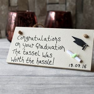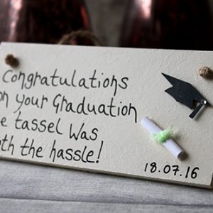 Personalise your college graduation gifts for friends Sign and choose the hanging version or desktop version. This “Congratulations” personalised graduation present ideas plaque makes the perfect gift for Graduation as a gift for new Graduates. These plaques are great for any deserving Graduate. Show this year’s graduate they are the best! This is a BIG plaque and measures 6 x 3 inches. It sits great on the kitchen / living room side or on a shelf.