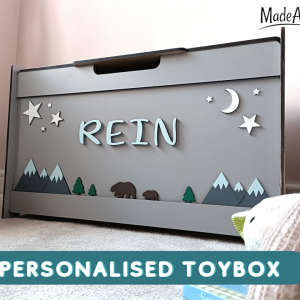 Our Kids Storage Box and Toybox was designed here at MadeAt94. We handmake 100% of our Wooden Bedroom Storage Units using a combination of laser cutting and our hands. All features of the box are painted and glued by hand. Beautifully designed and hand painted my toy boxes make the perfect addition to any play room, bedroom or living room for toy storage.