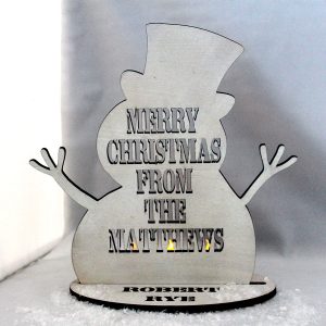 Another unique design from MadeAt94. The Snowman Tea light holder measures 26cm high with your chosen words’. Place tealights behind the glittery snowman and light up your family name!