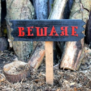 Prepare yourself for Halloween night with this outdoor “wooden Halloween Beware Sign” . Put outside your house and add to the fun occasion. This is an essential addition for every Halloween scene set up, and can be used year on year. The Halloween Beware Sign Measures 35cm by 10 cm with a 30cm Stick for the ground.